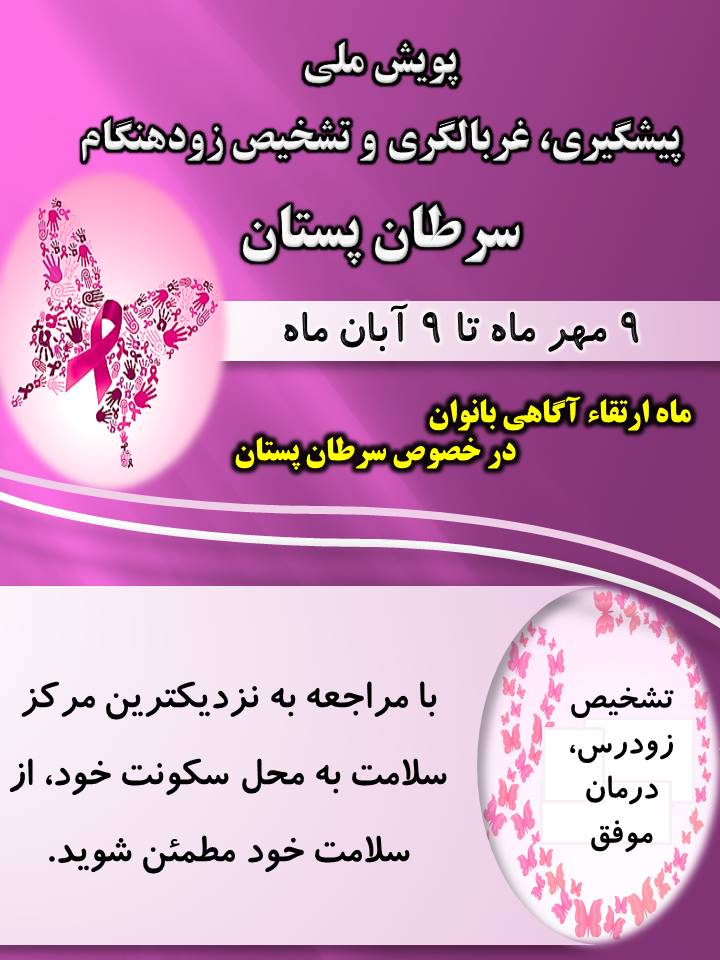 غربالگری و تشخیص زود هنگام پویش پیشگیری از سرطان پستان،9 مهر تا 9 آبان گروه خبری : پیام سلامت کد خبری : 134940 کپی کلیدواژه